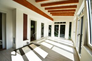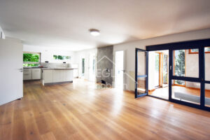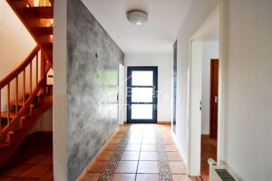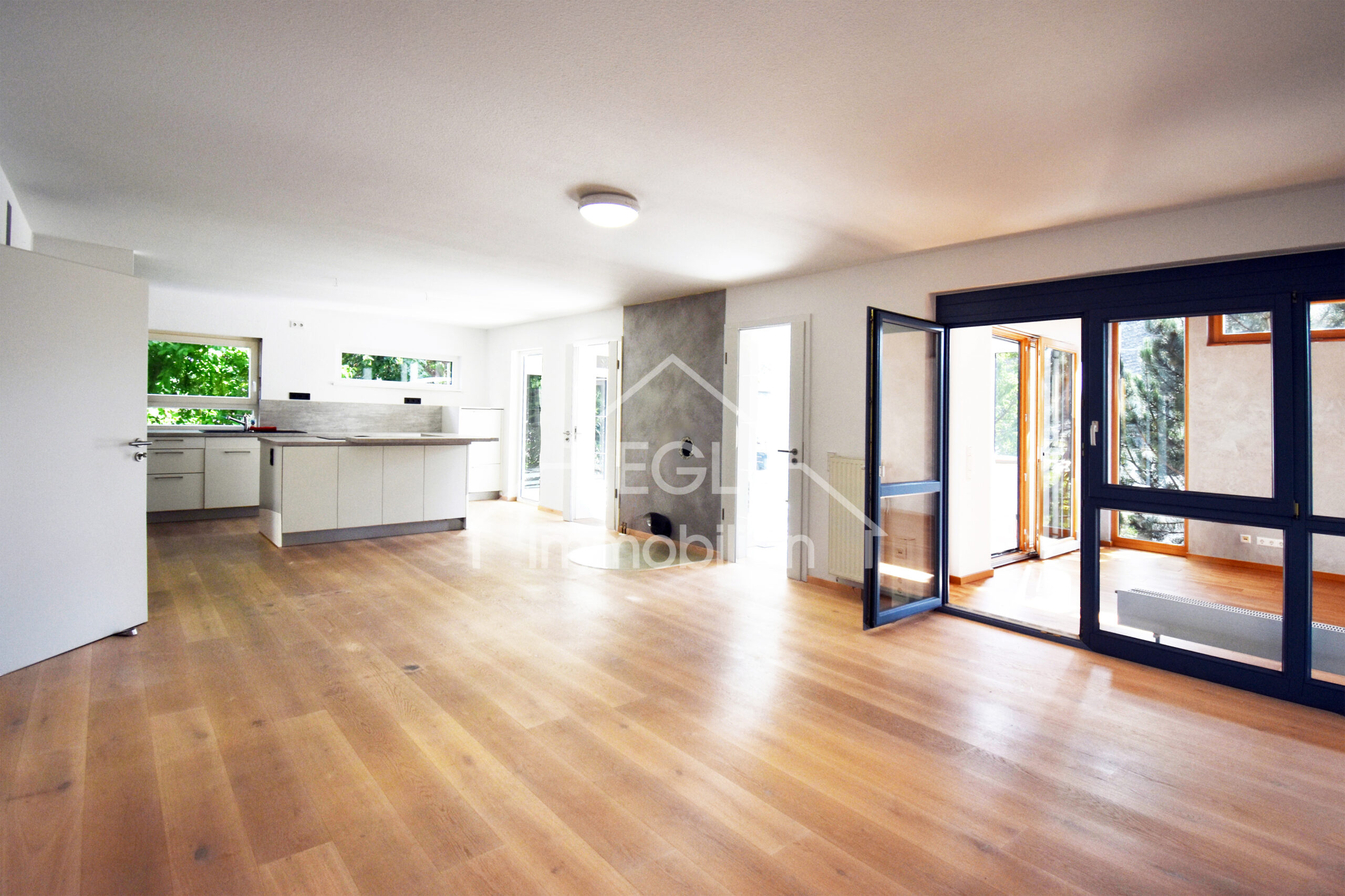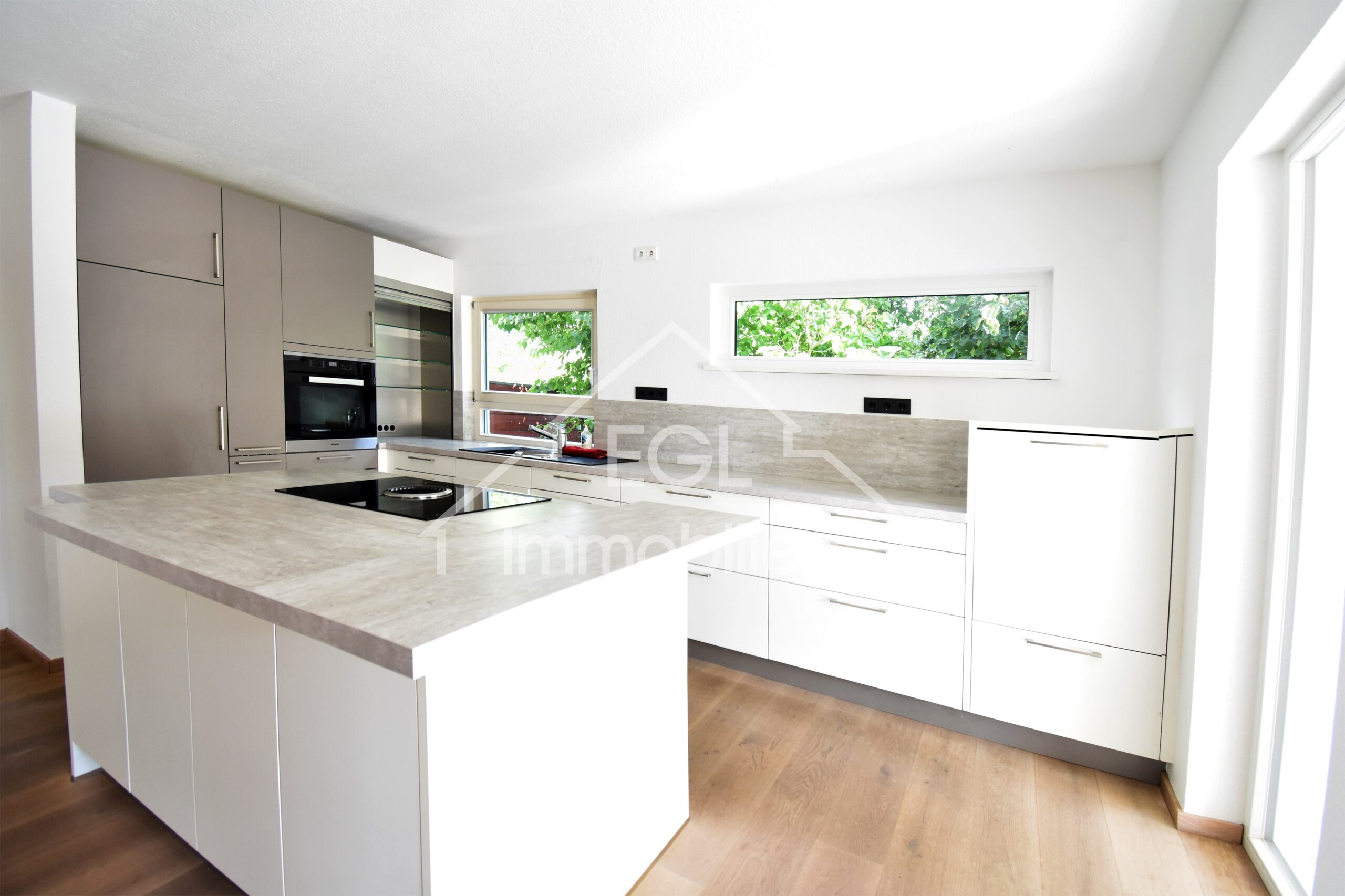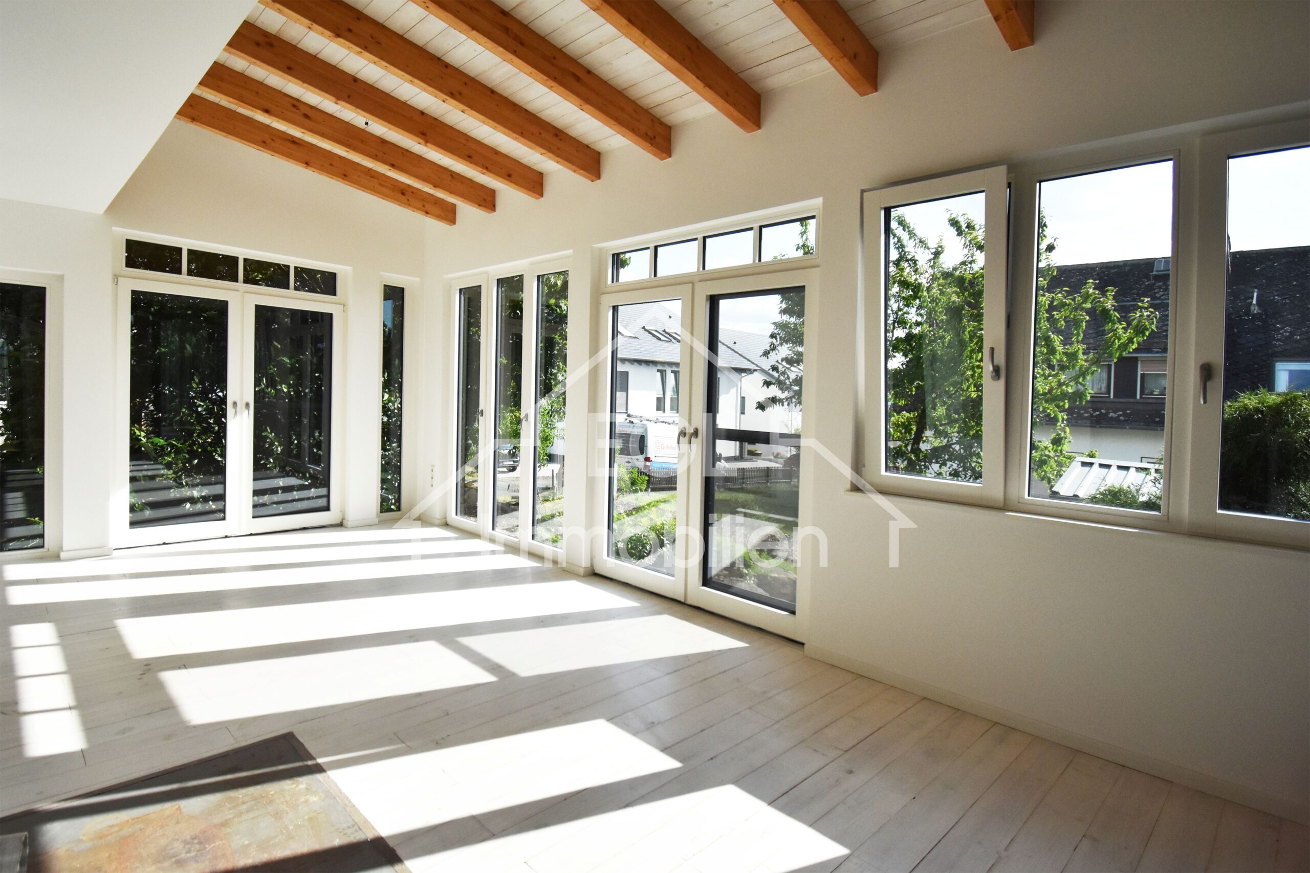 Dieses stilvolle in 2002 erbaute freistehende Einfamilienhaus überzeugt durch moderne Eleganz und ein großzügiges Raumgefühl. Die ca. 220 m2 Wohn- und Nutzfläche verteilen sich harmonisch auf zwei Etagen. Über den Flur gelangen Sie in den großen Küchen- und Wohnbereich, der durch bodentiefe Fenster mit Tageslicht durchflutet wird. Das offene Konzept mit der eleganten Küche mit Kochinsel und dem großzügigen Wohnzimmer schafft eine einladende Atmosphäre. Die fließenden Übergänge vom Wohnbereich über den Wintergarten bis hin zum Außenbereich unterstreichen das durchdachte Raumkonzept und ermöglichen ein naturnahes Wohnerlebnis mit zeitgemäßem Komfort. Im Erdgeschoss befindet sich ein weiteres Zimmer, der Hauswirtschaftsraum, der Hausanschlussraum und ein Gäste-WC. Die Büroeinheit, ebenfalls im Erdgeschoß, ist stilvoll durch eine Glaswand vom Wohnbereich semi-getrennt. Dank des separaten Eingangs und eines eigenen Gäste-WCs eignet sich dieser Bereich ideal für Selbstständige und/oder als Home-Office oder Atelier – ein durchdachtes Konzept, welches Wohnen und Arbeiten perfekt verbindet. In der oberen Etage befinden sich zwei Schlafzimmer und ein großes Bad. Ursprünglich waren es drei Schlafzimmer, diese Aufteilung wäre wieder ohne großen Aufwand umsetzbar. Der liebevoll gestaltete Garten lädt zum Verweilen und Entspannen ein – ein idealer Rückzugsort im Grünen. Ein praktischer Gartenschuppen und der Blick ins Umland schaffen eine harmonische Verbindung von Funktionalität und Naturerlebnis. Der Garten ist zusätzlich über eine Seitenstraße bequem befahrbar. Ihre Fahrzeuge parken Sie komfortabel seitlich am Haus.